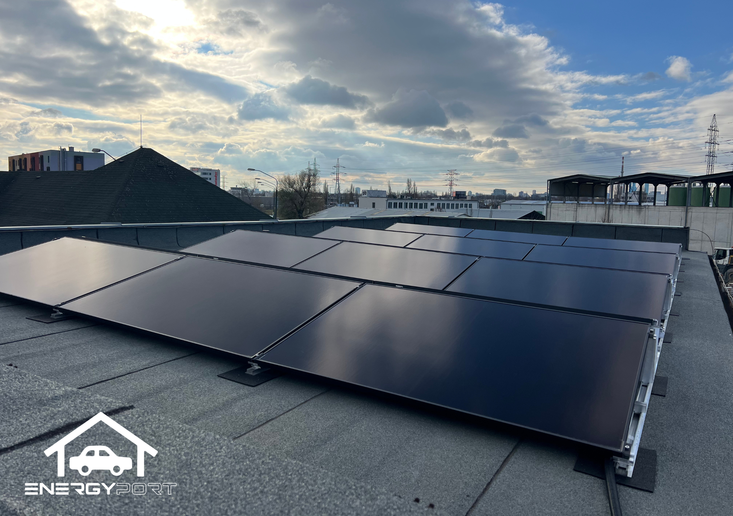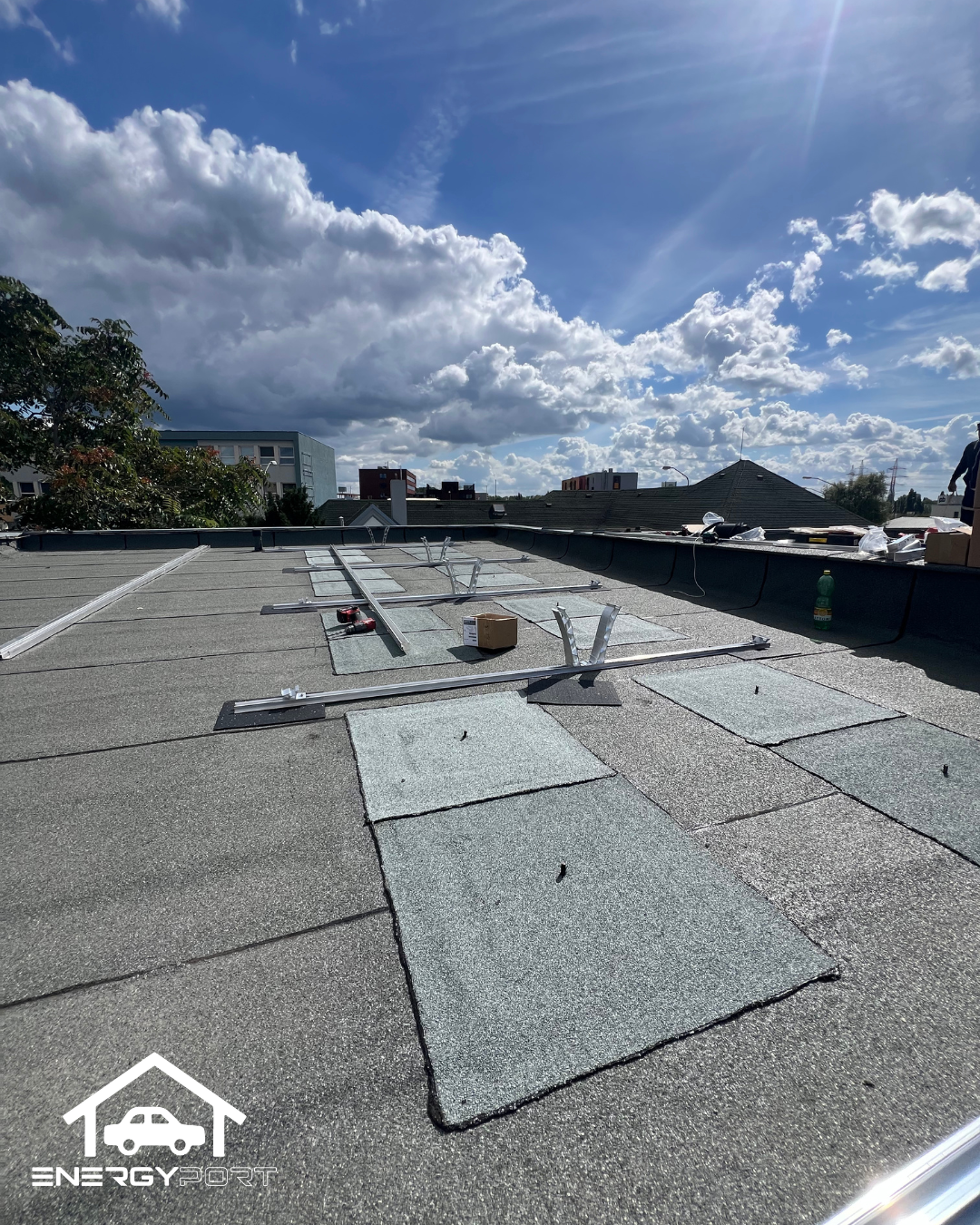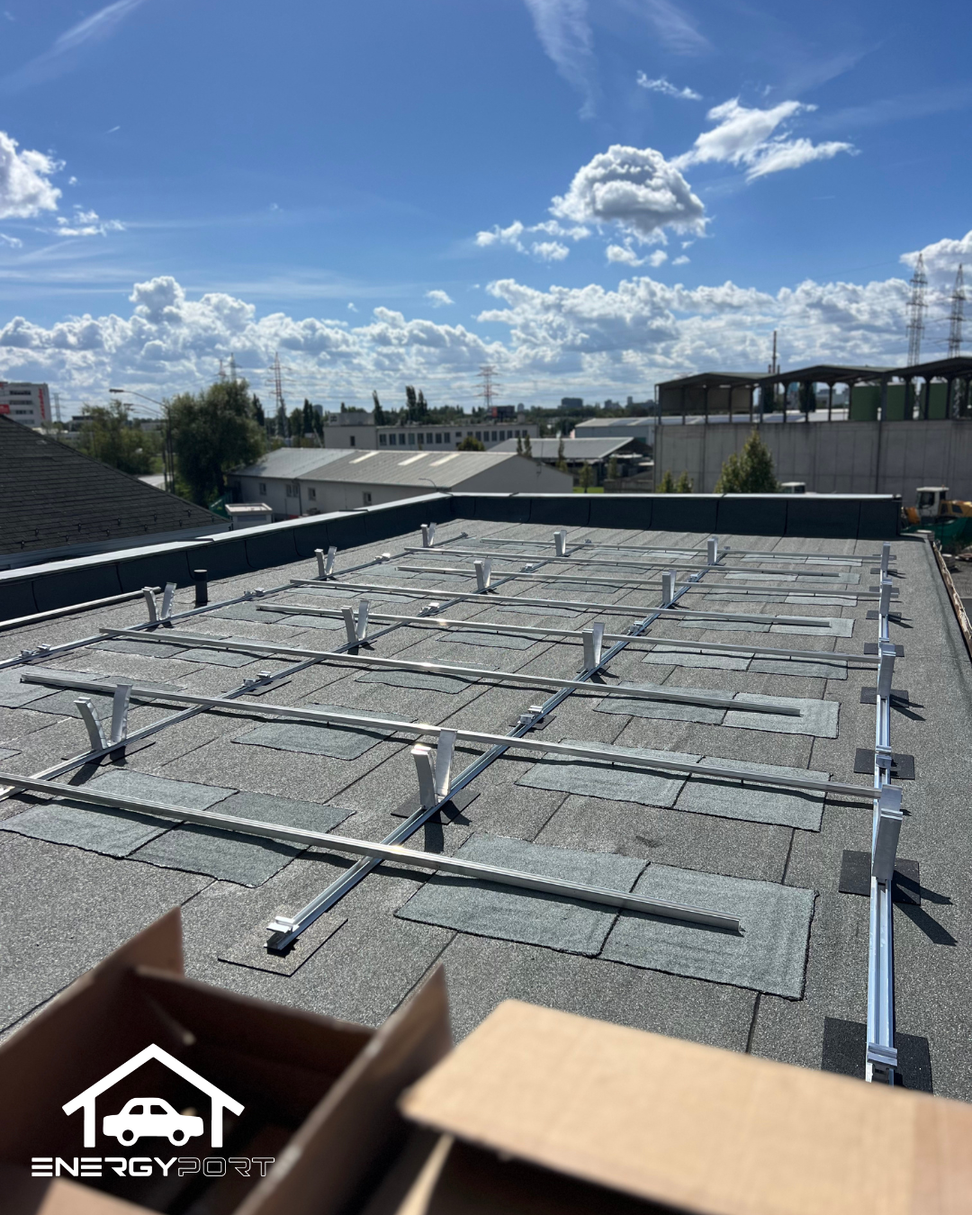 Pri návrhu konštrukcie sme kládli dôraz najmä na minimalizáciu zaťaženia strechy. Použili sme ľahký montážny systém so špeciálnymi nosnými platňami, ktoré boli v spolupráci s profesionálnymi strechármi zvárané priamo na asfaltovú strešnú krytinu. Týmto riešením sa podarilo znížiť zaťaženie strechy minimálne o 1 tonu v porovnaní s bežnými balastnými systémami.