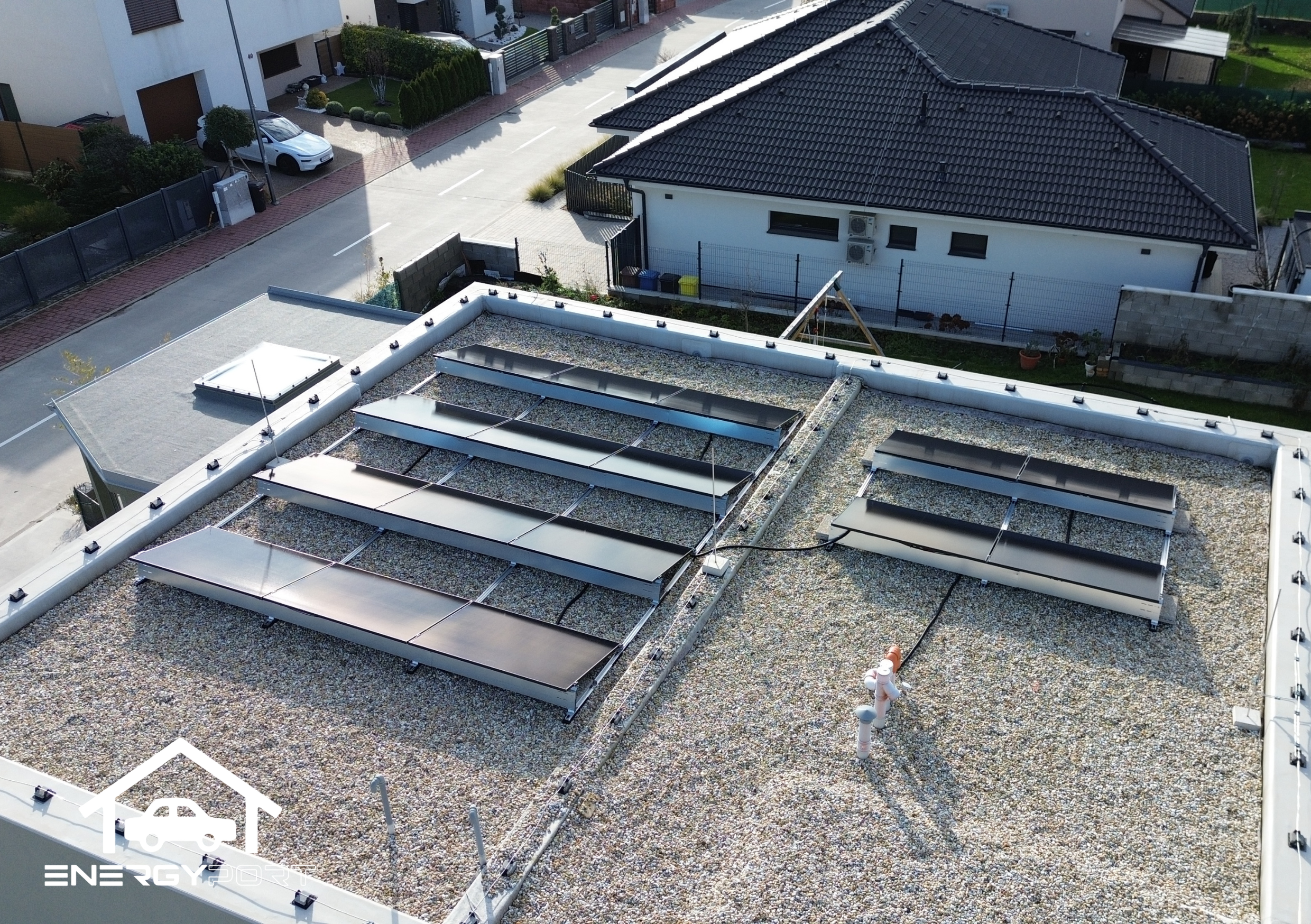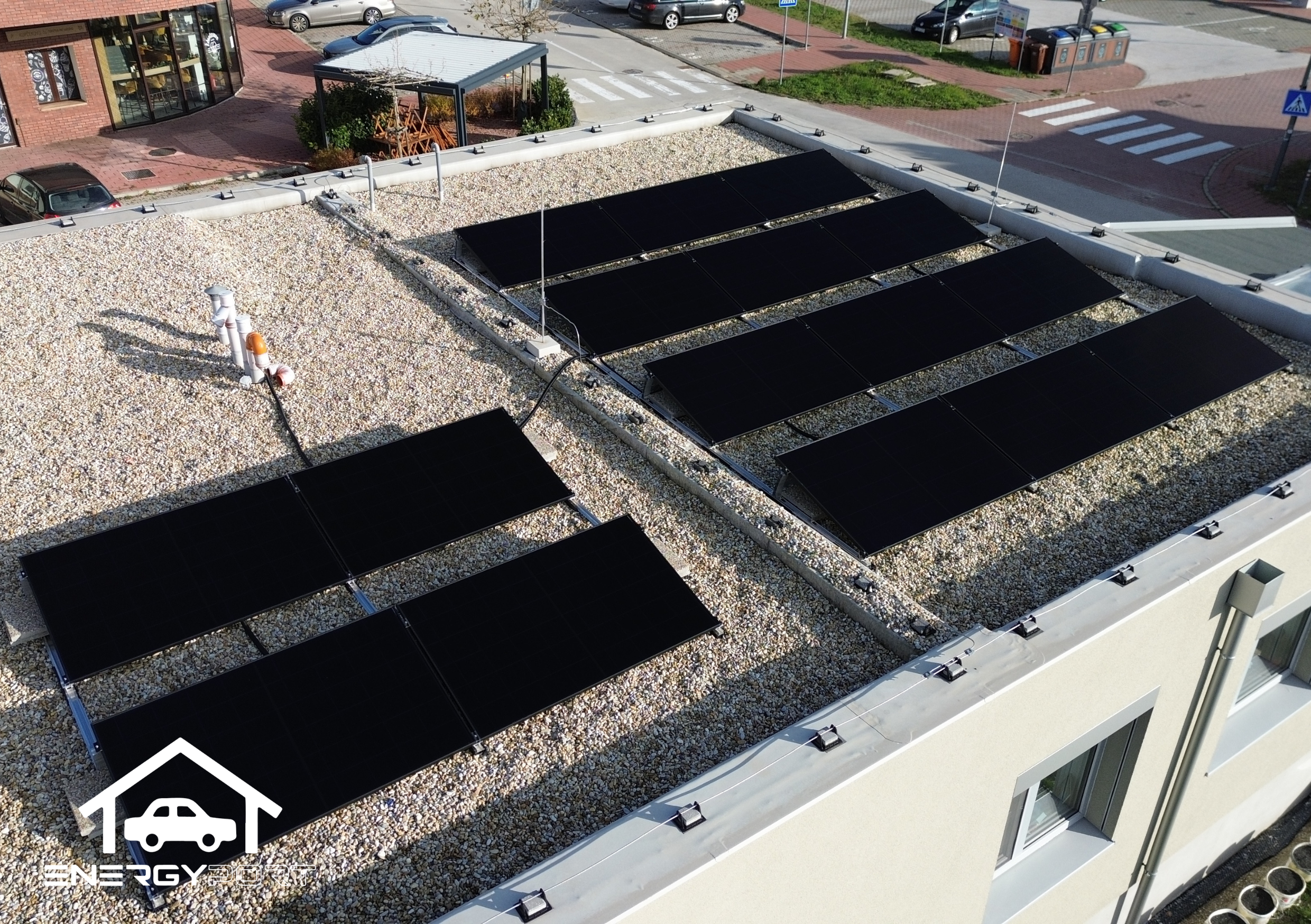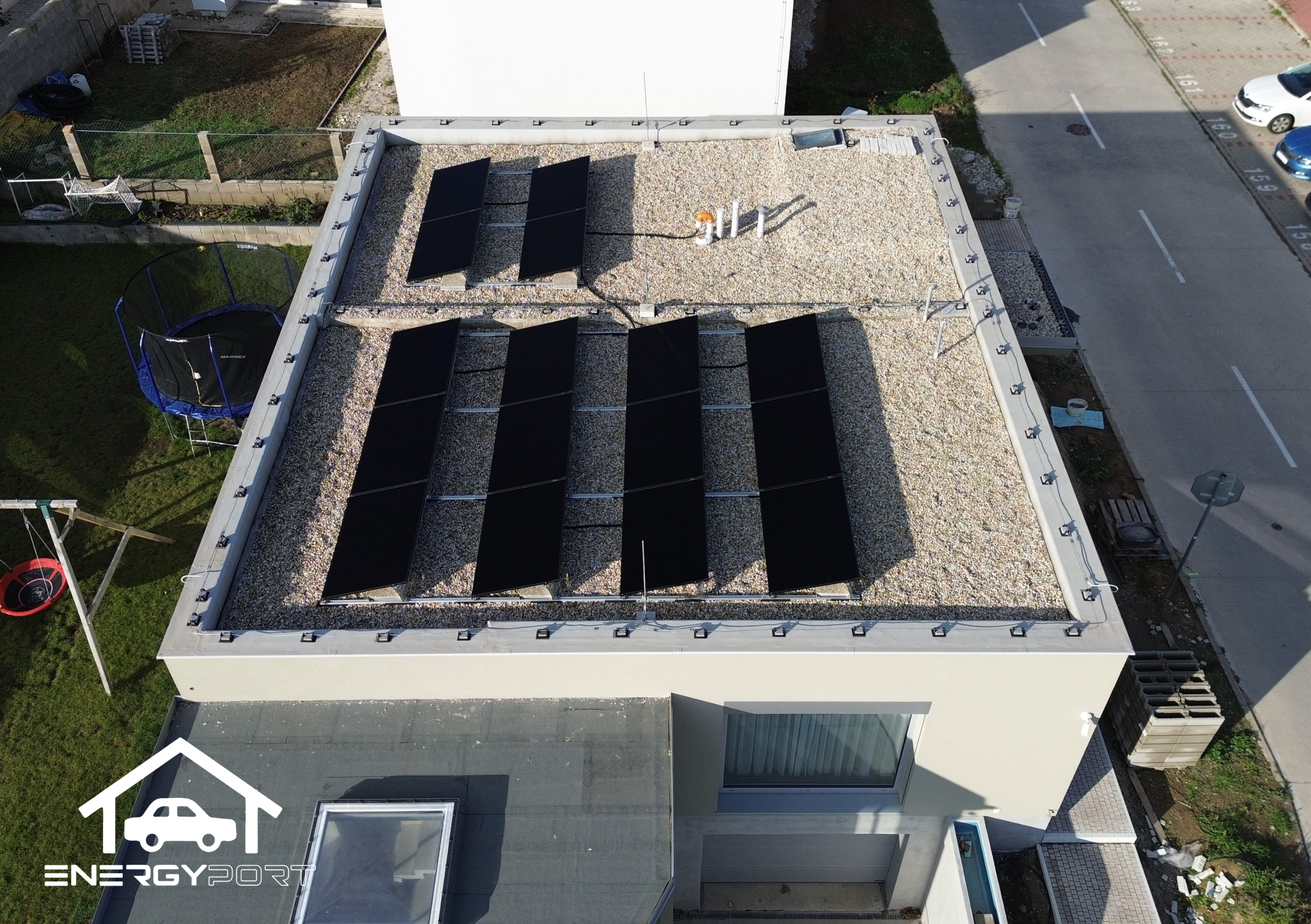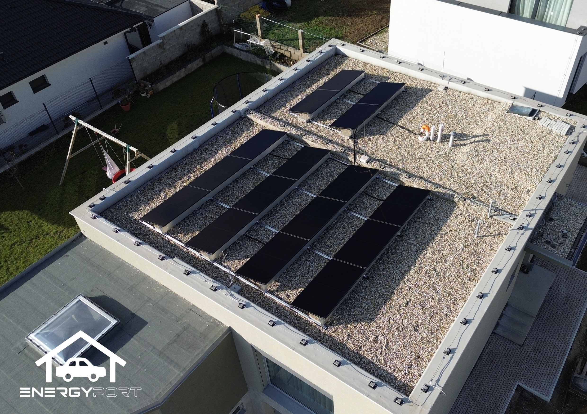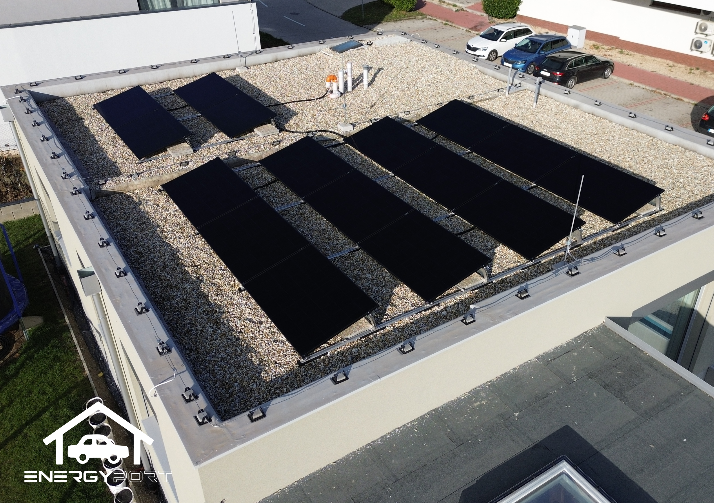 Elektráreň je orientovaná na juh, čo zabezpečuje optimálnu výrobu elektrickej energie počas celého roka. Použili sme moderné celočierne fotovoltické panely, ktoré okrem vysokého výkonu ponúkajú aj čistý a elegantný vzhľad.