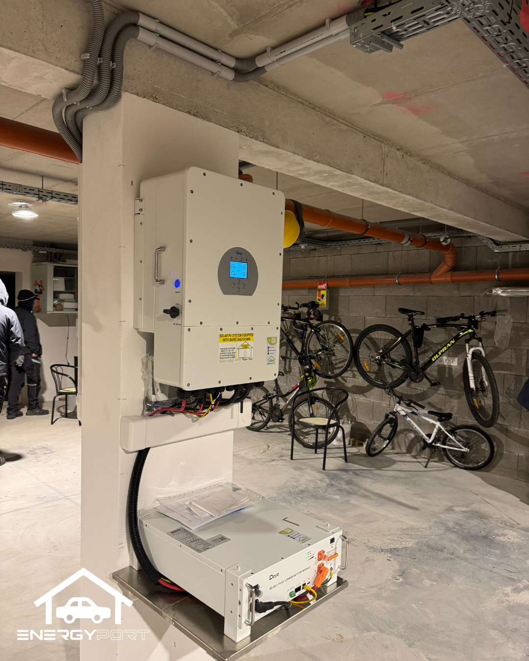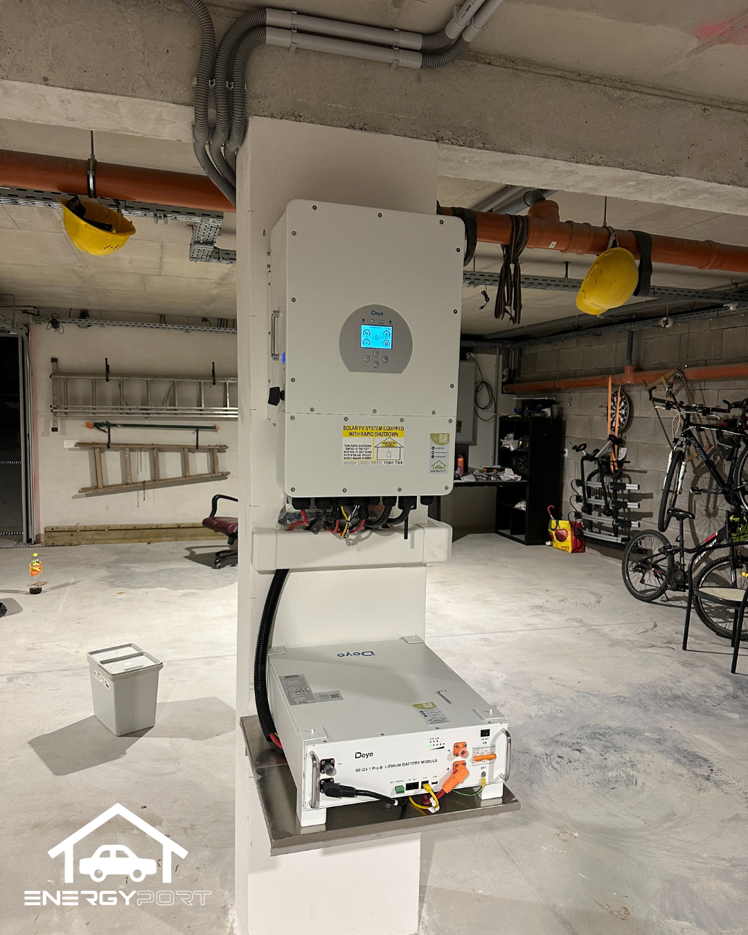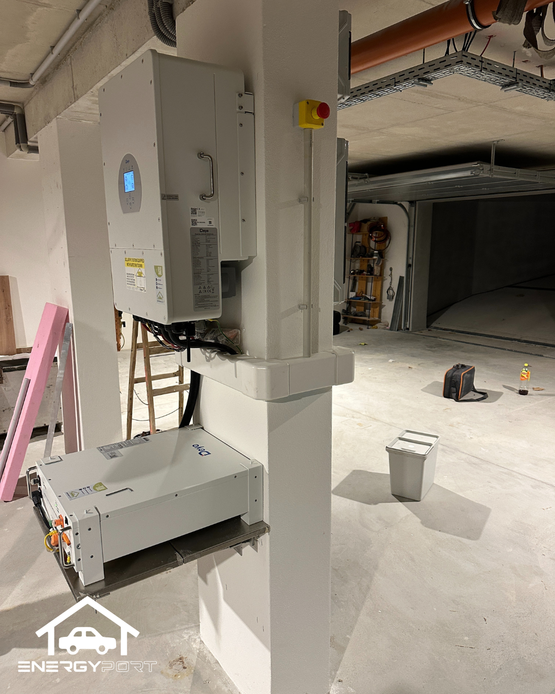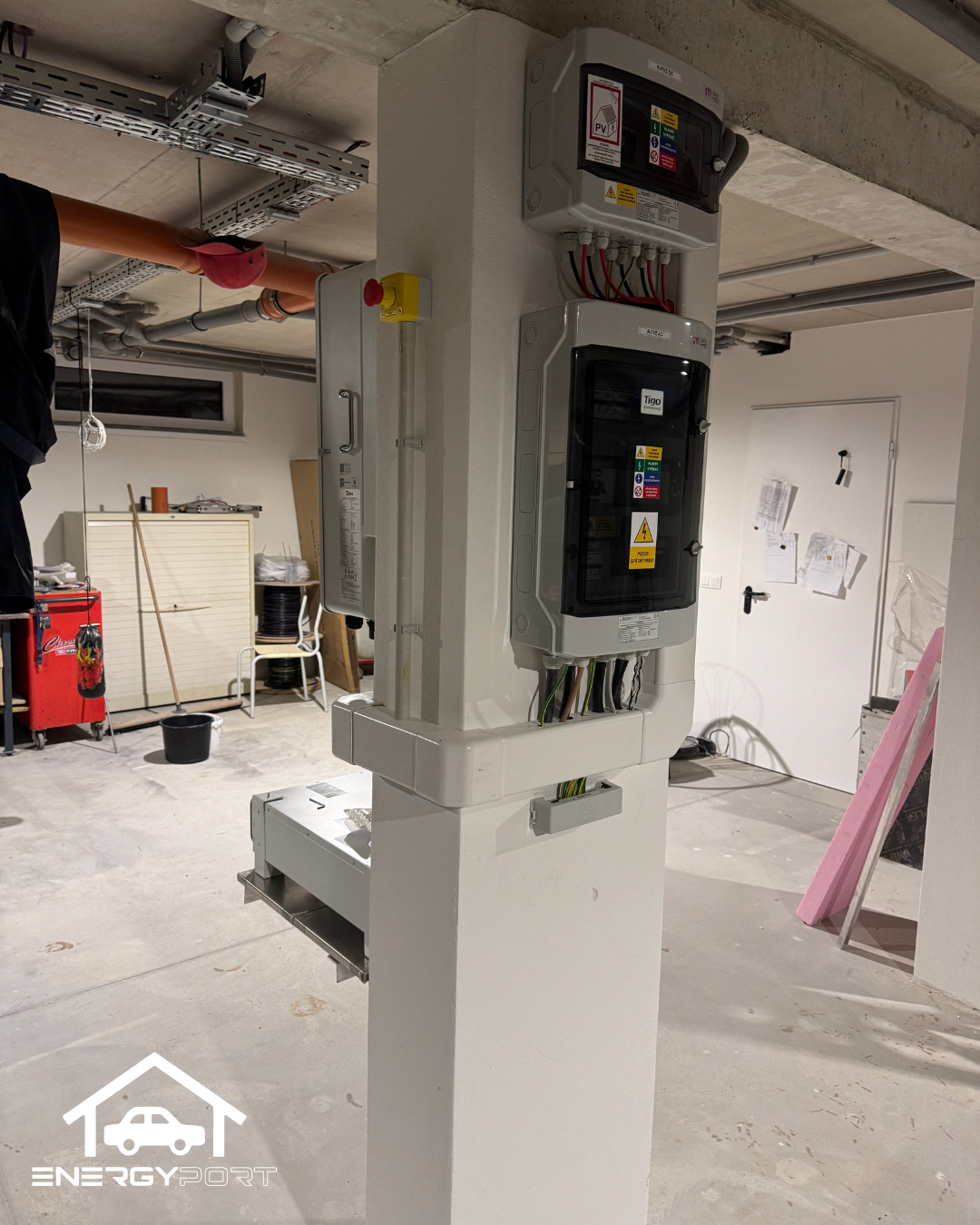 Batériové úložisko sme umiestnili na nosný stĺp v garáži tak, aby nebolo položené na podlahe, toto riešenie zvyšuje bezpečnosť pri mimoriadnych situáciách, ako sú napríklad možné záplavy.