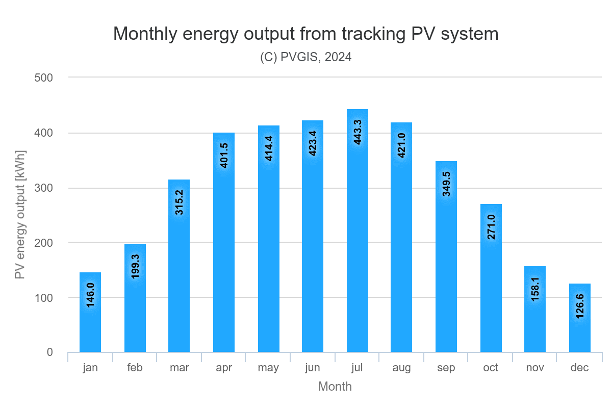 Vypočítaný výkon je za predpokladu orientácie na juh, bez zatienenia a so sklonom 35 stupňov. Celkové množstvo vyrobenej energie závisí aj od vašej lokality.