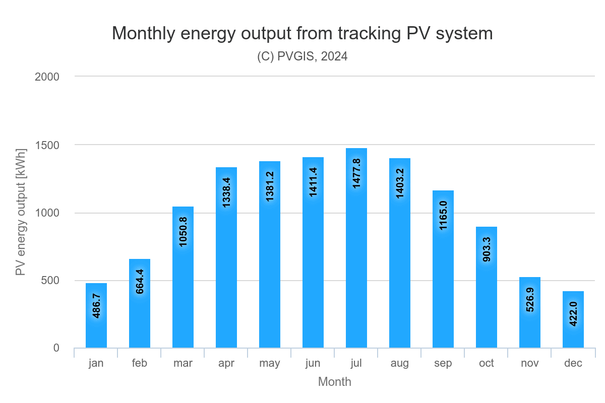 Vypočítaný výkon je za predpokladu orientácie na juh, bez zatienenia a so sklonom 35 stupňov. Celkové množstvo vyrobenej energie závisí aj od vašej lokality.