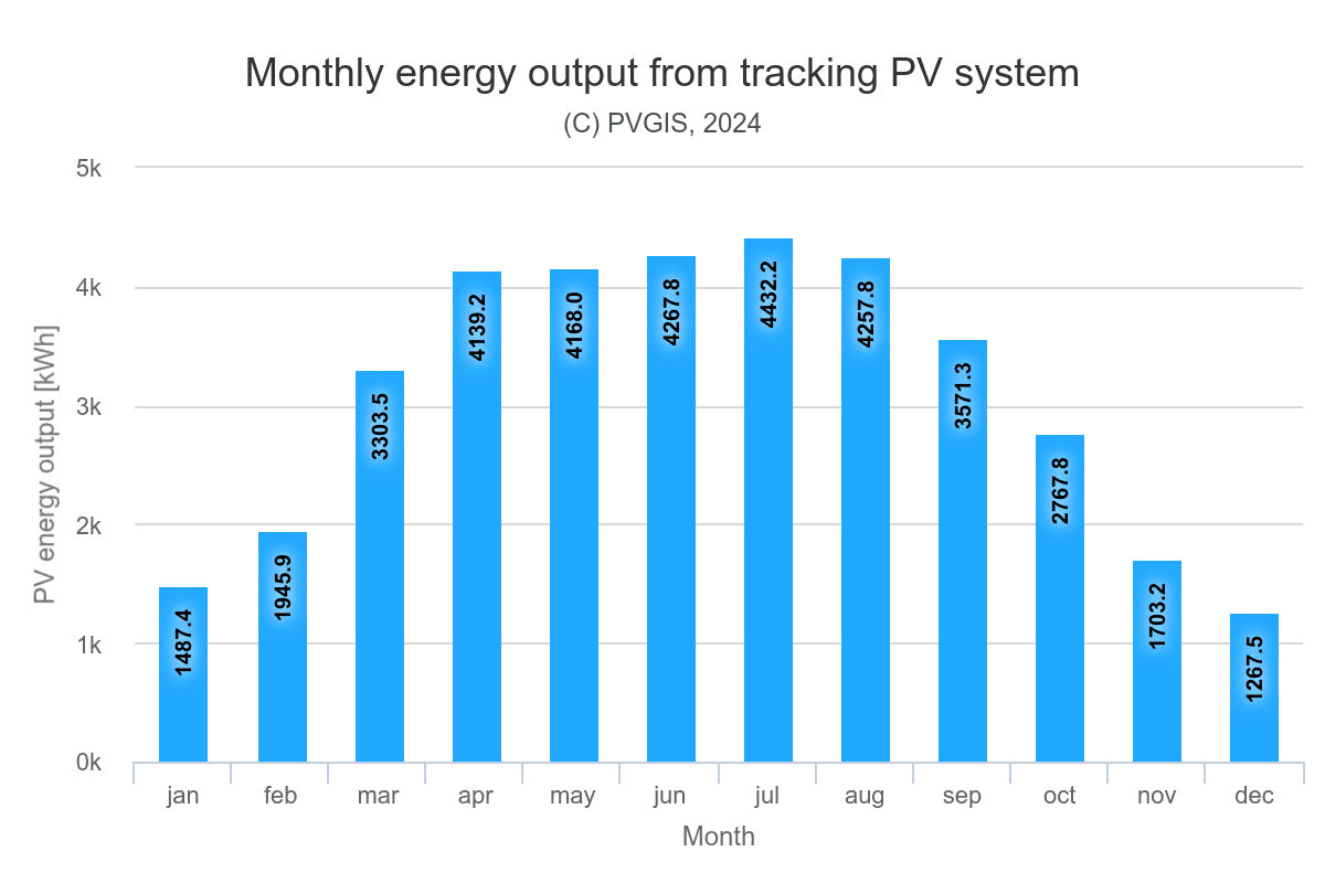 Vypočítaný výkon je za predpokladu orientácie na juh, bez zatienenia a so sklonom 35 stupňov. Celkové množstvo vyrobenej energie závisí aj od vašej lokality.