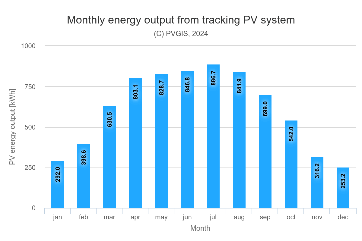 Vypočítaný výkon je za predpokladu orientácie na juh, bez zatienenia a so sklonom 35 stupňov. Celkové množstvo vyrobenej energie závisí aj od vašej lokality.